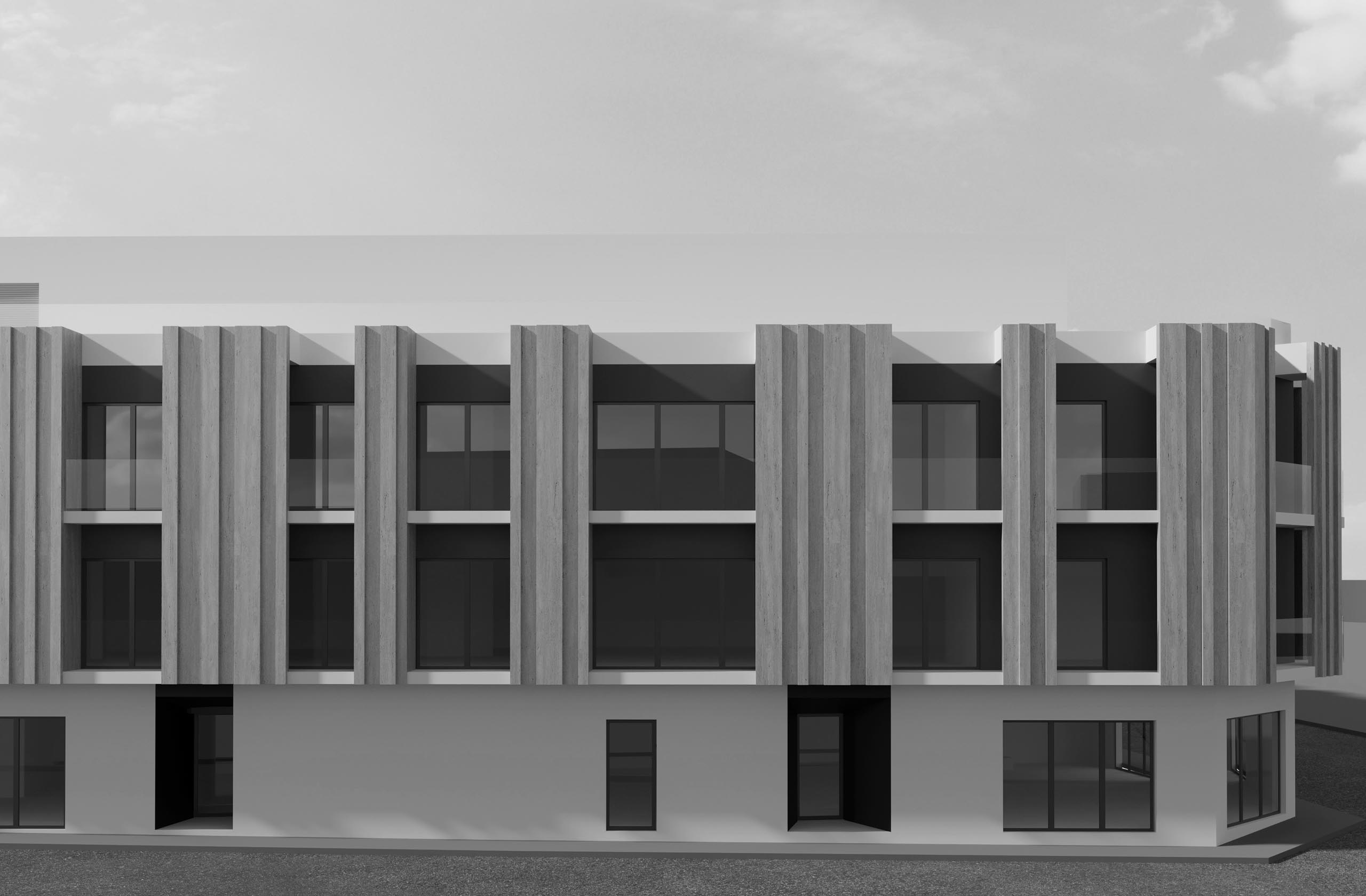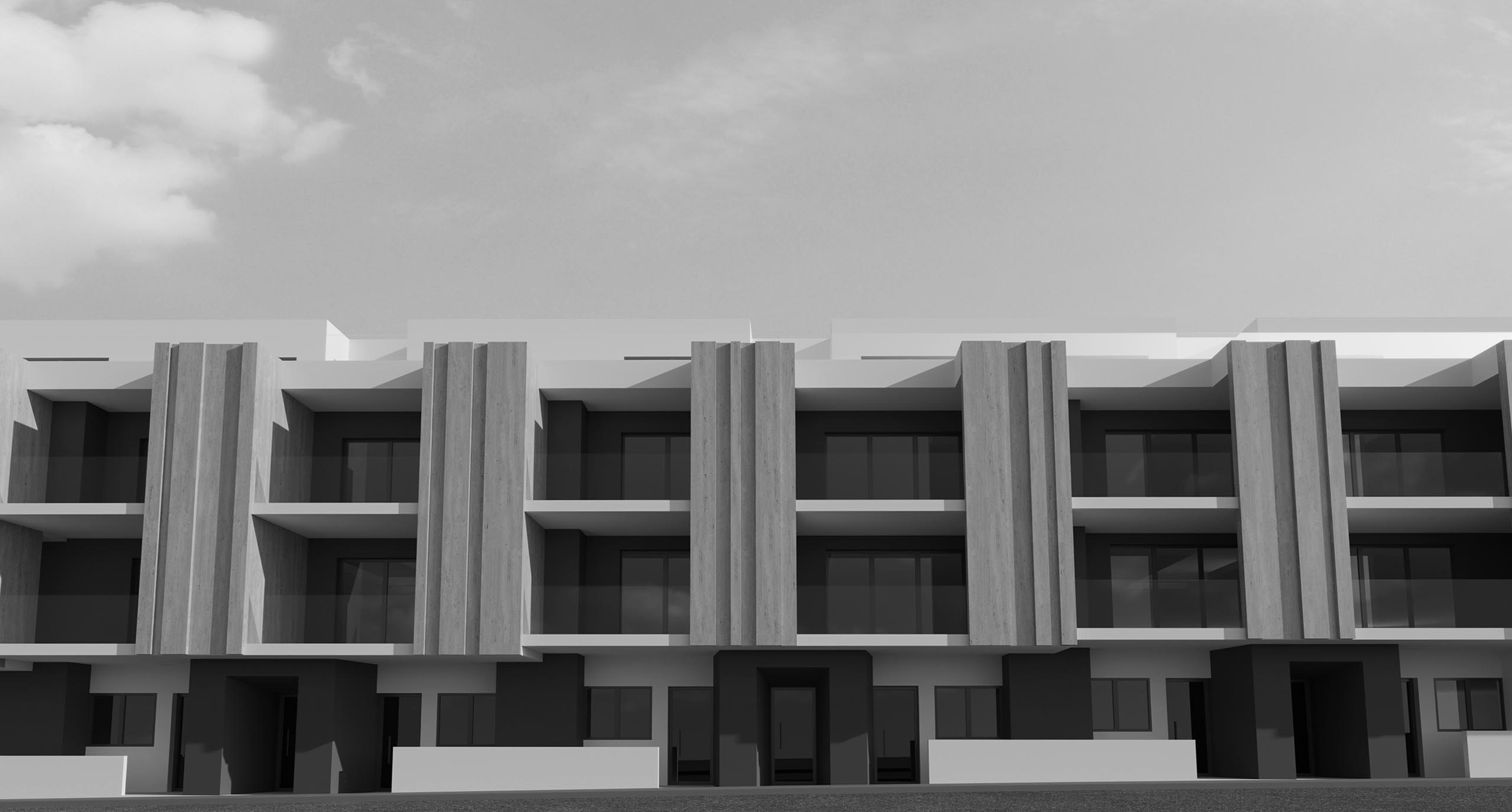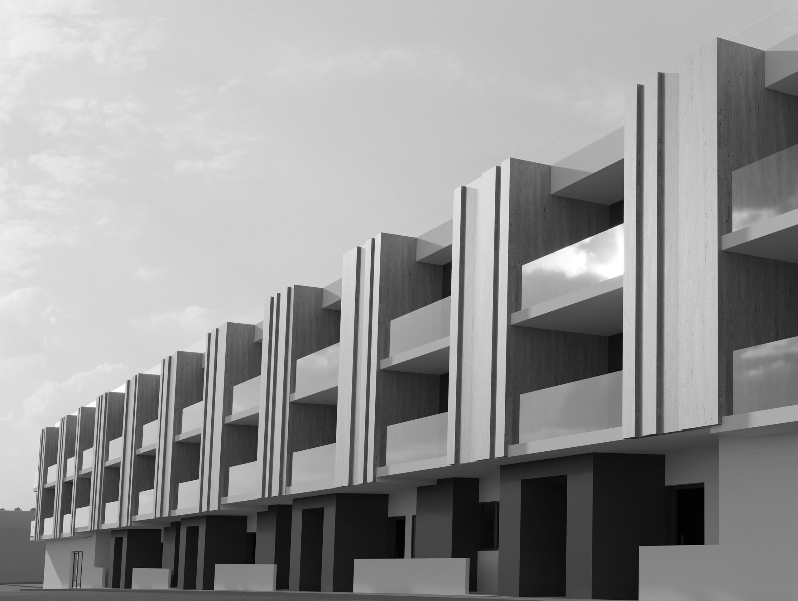 The introduction of imposing solid vertical elements aid the architectural rhythm while concealing the differences in levels between different apartments, as a result of a considerable street gradient.